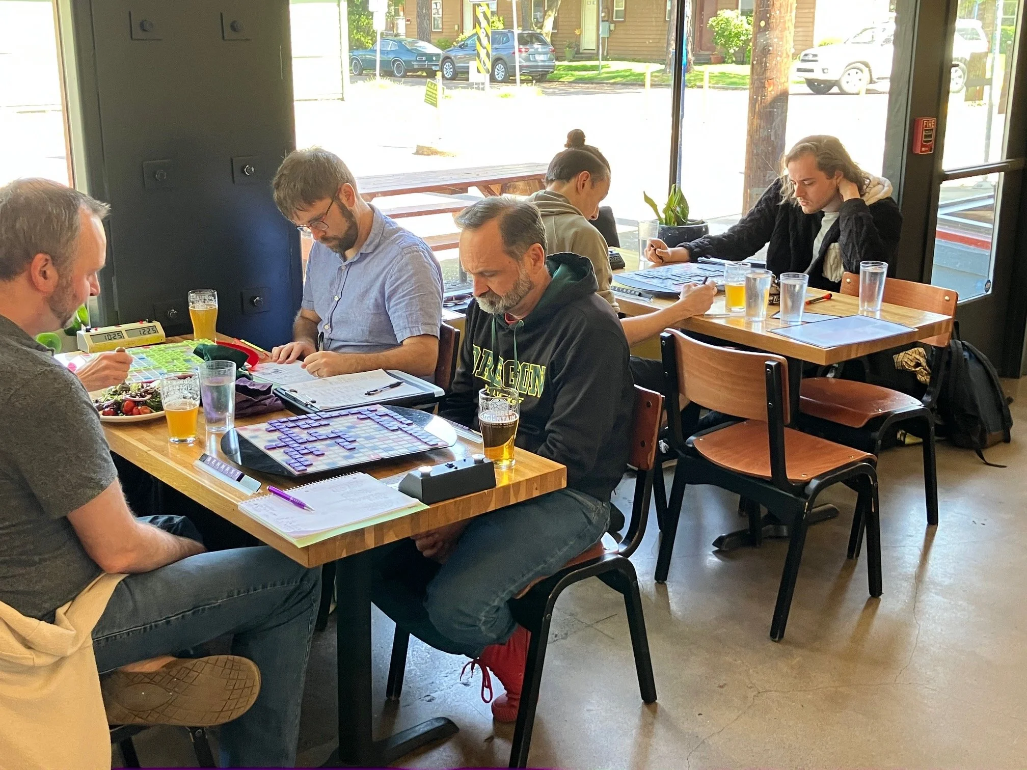 Next, it was on to the second Scrabble event, held at Migration Brewing. The same nine players were back at it again, and again, it was a slugfest at the top of the standings. Two-thirds of the way through the tournament, there were four of us tied for first place at 3-1 - it was Kolton Koehler, myself, Dave, and Conrad. Depending on how the final two rounds shook out, any one of us had a reasonable chance to win. Conrad beat Dave in round 5, and Kolton got me in an absolute squeaker, 391-384, that came down to a scrambled mess of an endgame in the final seconds. This pitted Kolton against CBB for the tournament - and it was Kolton who took it down, winning 496-363 in the final round. Props to Kolton.