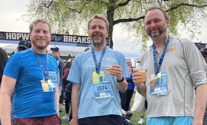 And then came the race. We ended up with a contingent of three Scrabblers signed up to run on Sunday morning - Dave, Chris, and myself (though we were joined by special guests including Chris' sister and the husband of my old college friend who I'd randomly bumped into on Friday afternoon). The race was fun! It was a winding course that sent us running back and forth across the Willamette River multiple times, crossing bridge after bridge. A couple of the bridges were pretty uphill and pretty grueling! But all of us persevered and finished. Dave set a new personal record in the 10K, while the rest of us merely survived. But hey, mere survival is something to be proud of. And a beer festival at the finish line makes all the pain worthwhile.